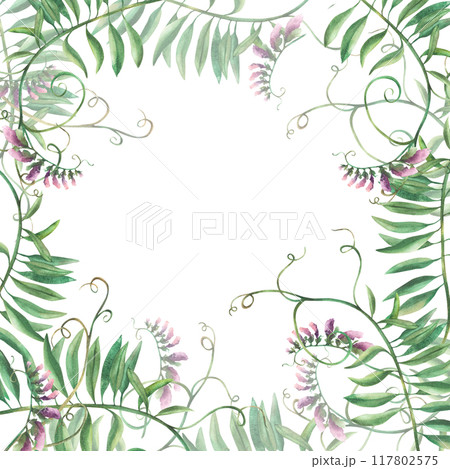 Wildflowers floral frame. Climbing plant with pink flowers, buds and green curly leaves. Watercolour illustration. Mouse pea bouquet template isolated from background. Meadow realistic grass clipart.