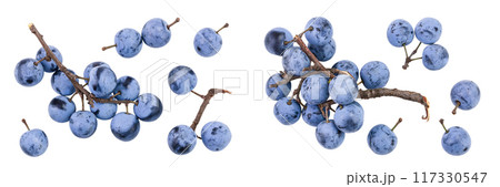 Fresh blackthorn berries with twig, prunus spinosa isolated on white background. Top view. Flat lay