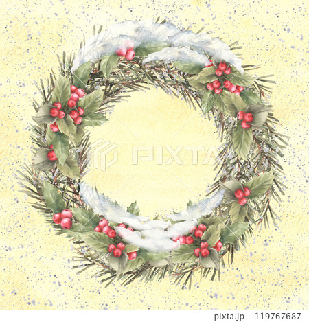 Snowy winter branch wreath. Christmas spruce twig with red holly berry plant. Festive card template. It is snowing. Hand drawn illustration on isolated watercolor grey yellow brush stroke background