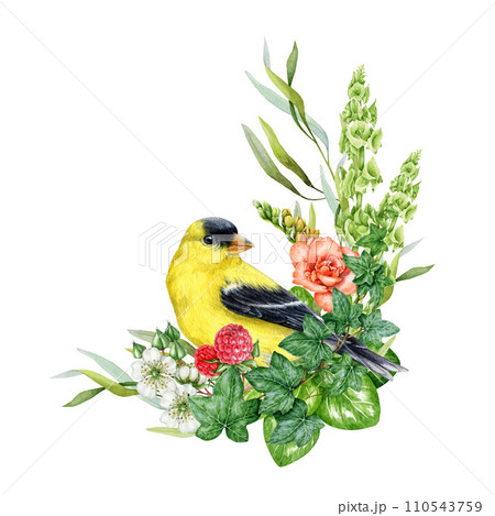 Garden flowers floral decor with goldfinch. Watercolor vintage style illustration. Painted rustic decoration. Blooming quince flowers, raspberry, green leaves, goldfinch bird. White background