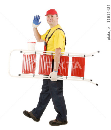Worker with ladder smiling.