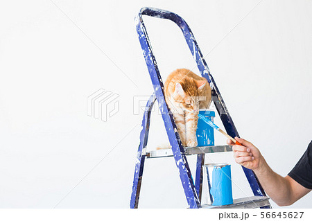 Repair, painting the walls, the cat sits on the stepladder. Funny picture with copy space