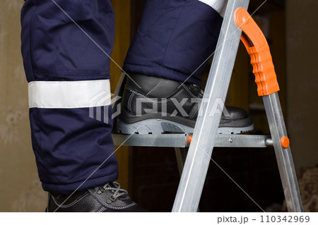 Legs of builder in special warm clothes and boots climb up metal stepladder. Concept of repair at height