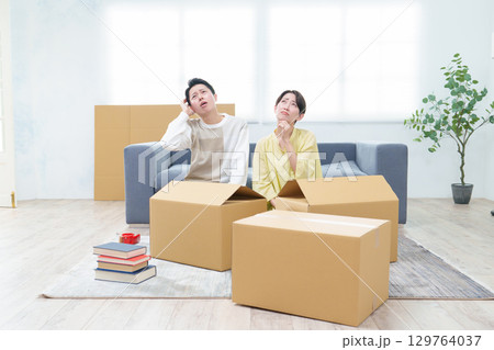 困った表情でダンボールを整理するカップル