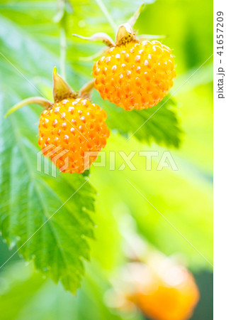 自然 植物 カジイチゴ、オレンジ色の艶々の実。甘酸っぱくてとても美味しい