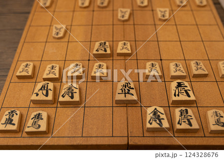 将棋盤の上に将棋の駒が並べられている 初手で角頭を開けている