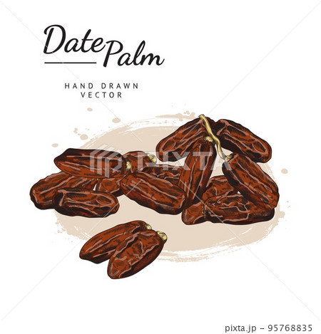 Dried fruits of dates, colored sketch vector illustration on white background.
