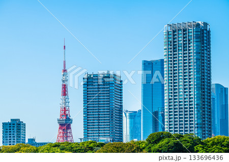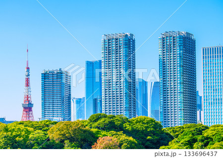日本の東京都市景観 六本木ヒルズや麻布台ヒルズ森JPタワー、東京タワーなどを望む
