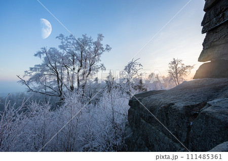 Evening frozen winter landscape with rock and frozen trees