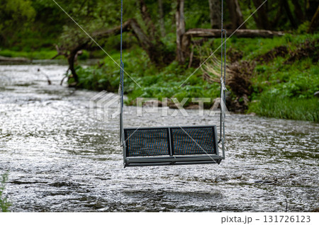 empty swing hanging on ropes above a fast flowing river, concept of active recreation