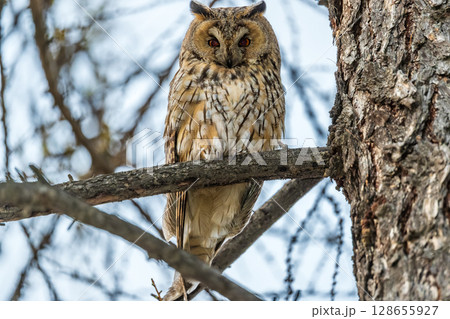 Long-eared owl (Asio otus), looking forward with wide opened eyes