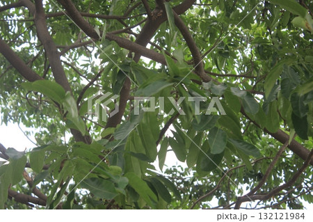 Looking up through lush green leaves and branches of a tree, with dappled sunlight filtering through