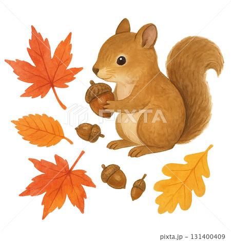 秋の落ち葉とどんぐりとリスの水彩イラスト かわいい小動物素材