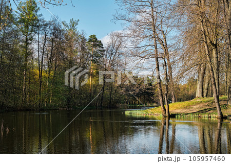 Beautiful spring lake in a public forest park. Spring early evening, sunny day, blue sky with clouds. Northern nature, beginning of spring. Banner idea