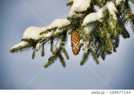 Spruce Picea is a coniferous evergreen tree of the Pine family Pinaceae. Evergreen trees. Common spruce, or Norway spruce Picea abies is widespread in northern Europe. Snowy winter coniferous forest.
