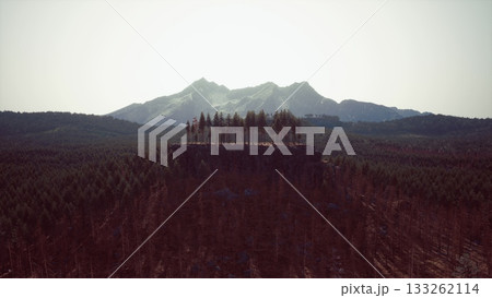 Towering mountains rise in the background while a unique plateau is adorned with a cluster of trees, creating a breathtaking view of natures splendor at sunrise, illuminating the serene environment.