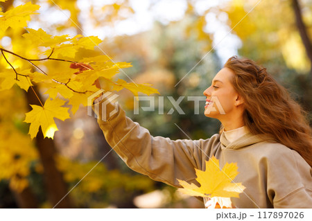 Smiling young woman enjoys the autumn weather in the forest with the yellow leaves at sunset
