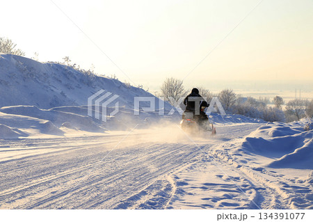 Outdoor winter sports in Russia.In the photo, athletes on snowmobiles ride on snowy off-road, in a wild impassable area.Surrounded by a beautiful winter backdrop with trees covered in frost