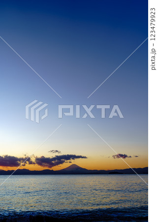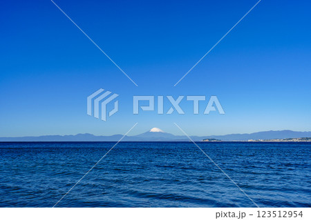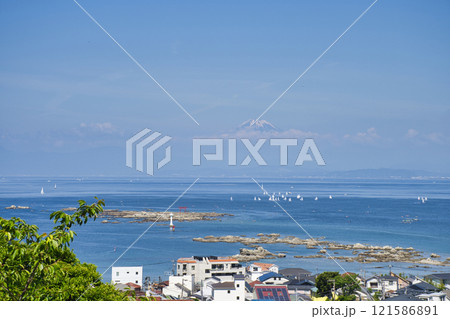 森戸海岸から望む富士山と青く広がる海の風景 神奈川県葉山町