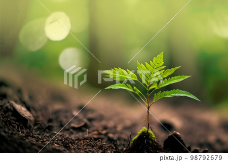 Close-up of a young plant growing amidst the lush greenery of the forest. Generative AI illustration