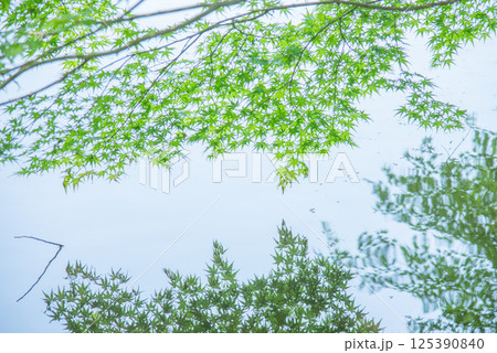 池に映り込むモミジの若葉