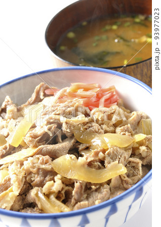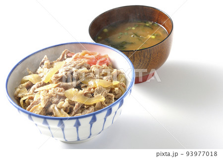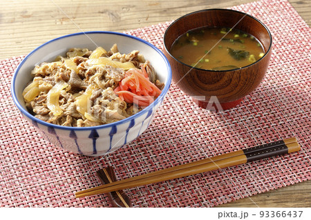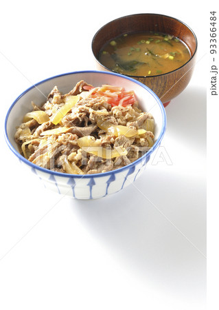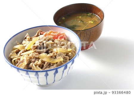 紅生姜が乗っているシンプル熱々牛丼と熱々味噌汁を白背景で撮影