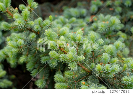 Blue spruce branches in the garden, texture of needles of a Christmas tree