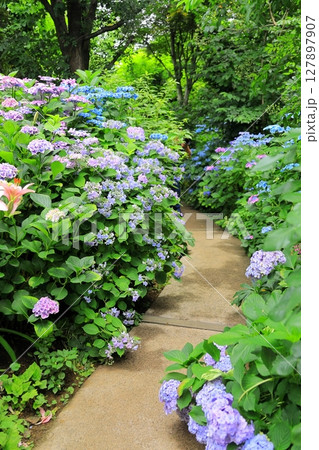 梅雨入り前の晴れた午後、狭山市智光山公園都市緑化植物園のひょうたん池、岸辺に紫のアジサイが咲く