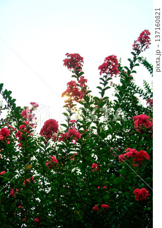 Close-up of the low angle view of Tuscarora Crape Myrtle tree in bloom in sunset. Flower and plant.