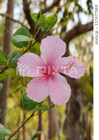 Close-up of Hibiscus flowers in the garden. Pink and red hibiscus flowers with green leaves in rural. Flower and plant.