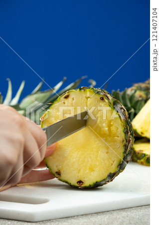 Hands cutting fresh pineapple fruit into pieces.