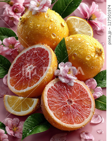 Juicy oranges and grapefruits with fresh blooms: vivid citrus fruits and flowers on a vibrant pink background