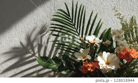 White and Orange Flowers with Palm Leaves on Textured Background