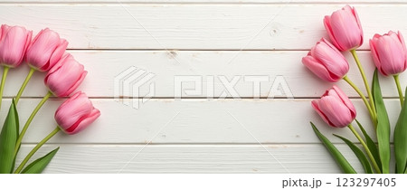 Pink tulips on white wooden background, floral frame with copy space in center, springtime concept for greeting card or invitation