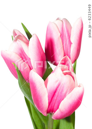 Beautiful spring bouquet of pink tulips with green leaves isolated on a white background for a floral gift