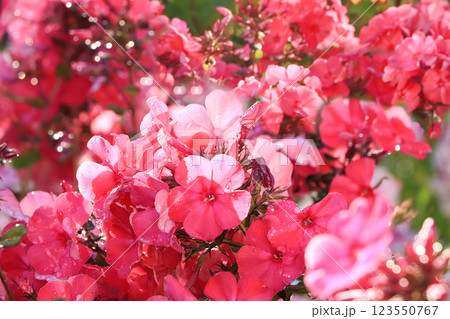 Abstract floral background.Summer rain in the garden and flowers with drops and bokeh, blurred focus. Beautiful summer garden in the early morning with natural bokeh and rain, summer postcard