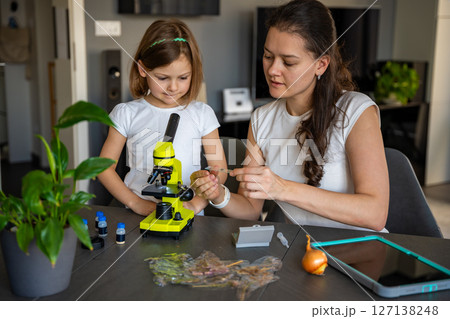 Mother and daughter examining various plant samples under a microscope at home. Concept of family science education and botanical exploration