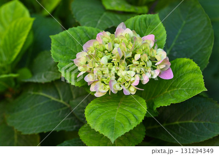 Close up of a pink flower surrounded by lush green leaves