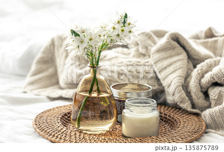 Home composition with flowers in vases and a knitted element.