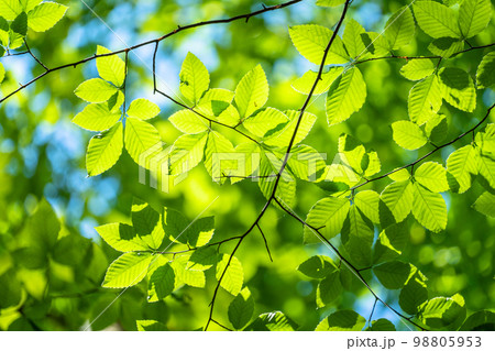 大宮池の新緑のモミジとカモ 鳥取県 樗谿公園