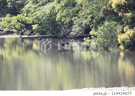 勢いが良い葉達をまとっている双松公園の裏の森の風景