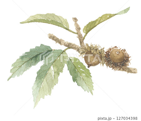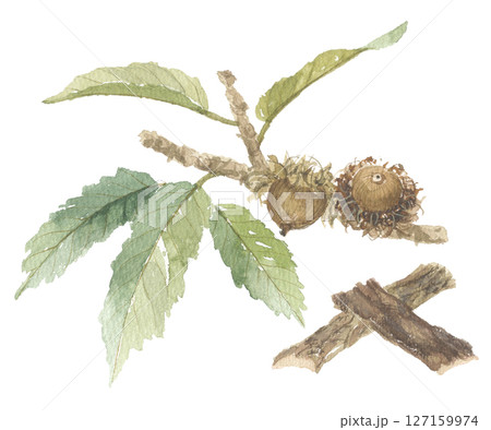 水彩で描いたクヌギと樹皮 樸樕 ボクソク