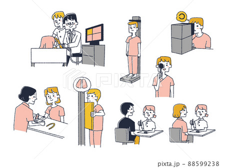 健康診断、人間ドッグに関するイラストセット1 コミカルな手書きの人物 ベクター、線画にカラー