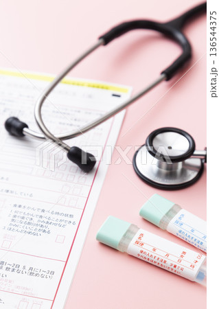 ピンク背景に検便キットと聴診器