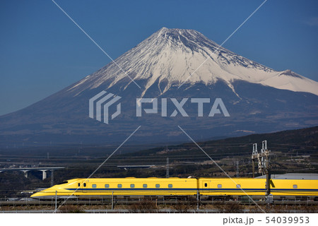 (静岡県)富士山を背に、富士川鉄橋を走る新幹線ドクターイエロー