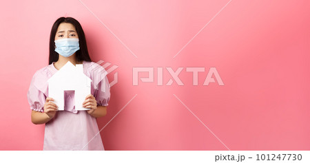 Real estate and pandemic concept. Begging asian girl showing paper house cutout, wearing medical mask, asking for apartment, standing against pink background