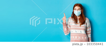 Winter, covid-19 and quarantine concept. Curious redhead girl in medical mask picking product, looking and pointing at upper left corner promo, blue background