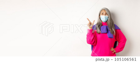 Covid-19, quarantine and lockdown concept. Amazed asian senior woman in face mask looking impressed, showing logo on upper left corner, pointing at banner, white background