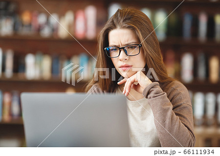 Beautiful self-employed girl works from home. Young woman online studying, watching course on website, looking at laptop screen