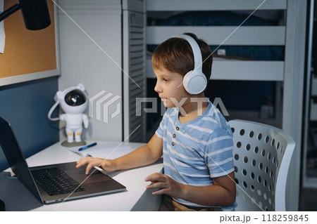 caucasian little boy wearing wireless headphones studying at home using laptop